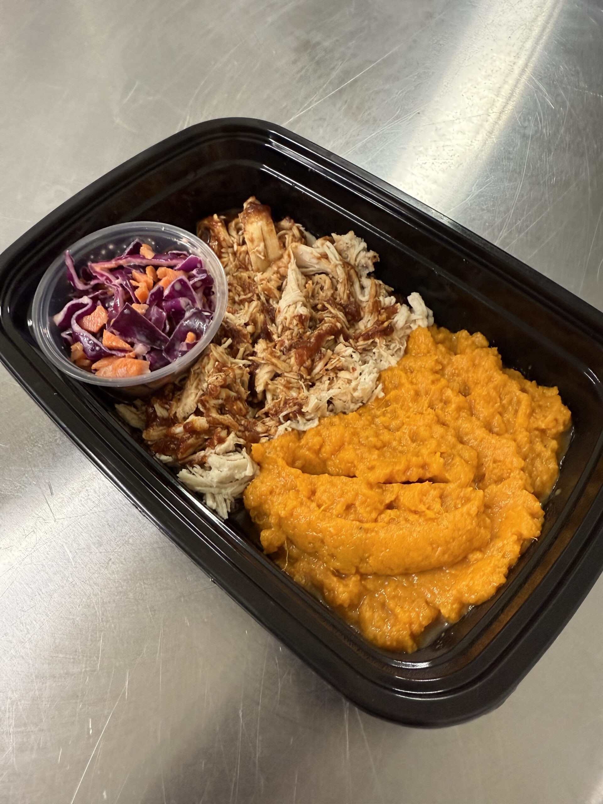 Amish chicken, shredded and tossed with barbecue sauce, with a side of broccoli or mashed sweet potatoes